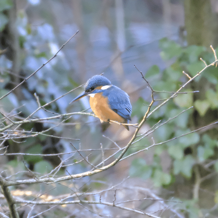 Iets verderop blijf ik opeens stil staan, ik heb de roep van de ijsvogel gehoord, een heel hoog piepje tussen alle andere geluiden om ons heen. De ijsvogel is heel actief aan het vliegen en roepen. Eerst in de els boven het water, dan weer naar de hulst aan de overkant, nee toch in de wilg! Elke keer als de telescoop op de ijsvogel gericht staat, vliegt hij weer weg. Maar we blijven volhouden. Een onwaarschijnlijke edelsteen met vleugels en een snavel. Turquoise en saffier van achter, vurig oranje van voren, schitterend in de winterzon. Wij kunnen er allemaal van genieten. Bart, een van de deelnemers vandaag heeft een flinke lens meegenomen, en weet prachtige foto’s te maken die je bij dit verslag kan zien.